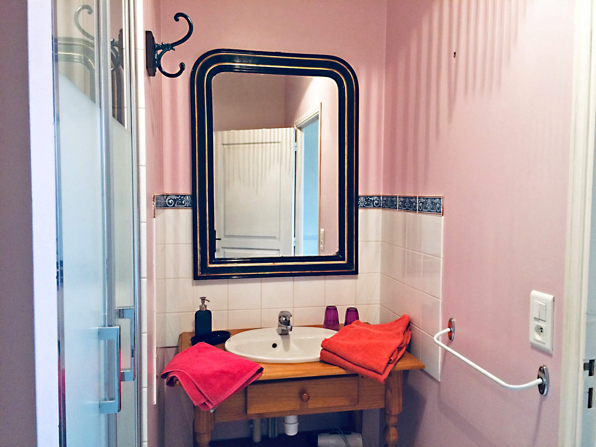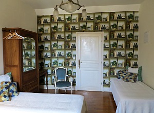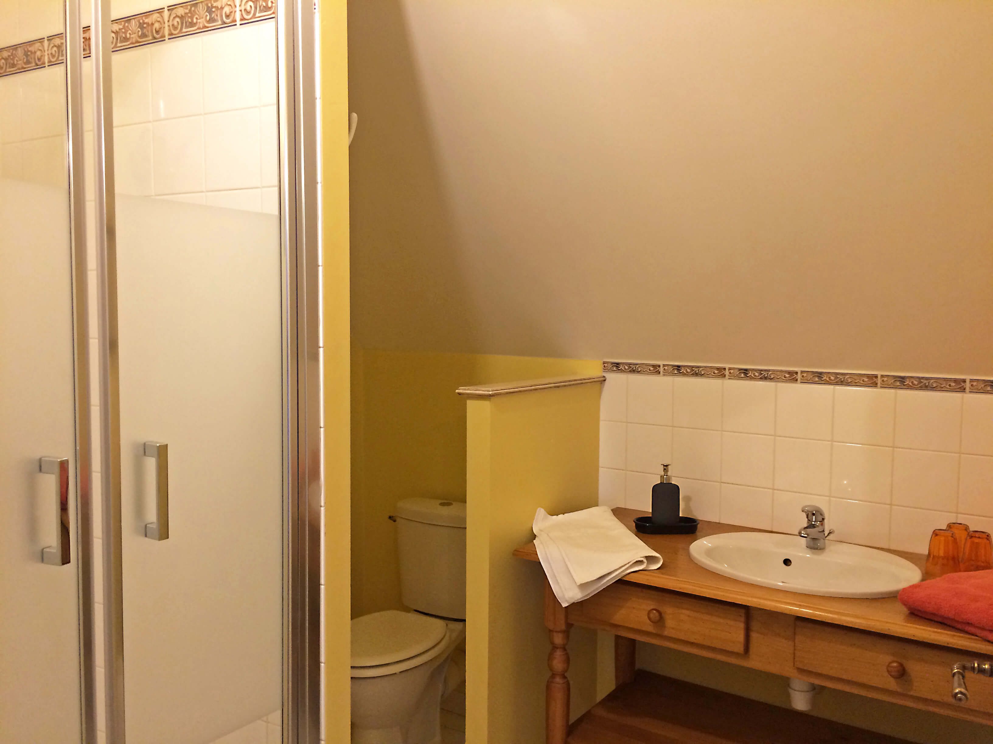 1 double lit, 2 lits séparés, petite table, chaise, rangement, deuxième étage, douche et WC